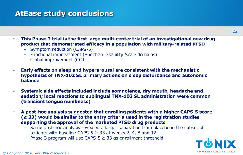 Rate of remission from PTSD in each treatment arm 14.3% 17.1% 28.9% 0% 5% 10% 15% 20% 25% 30% 35% Placebo(N=77) TNX-102 SL 2.8 mg(N=70) TNX-102 SL 5.6 mg(N=38) Percent of Remitters in Group #p=0.10 NS, comparing placebo and TNX-102 SL 5.6 mg, logistic regression # Remission is defined as CAPS-5 score <11 at week 12 Trend for greater rate in TNX-102 SL 5.6 mg versus placebo in entry CAPS-5 ≥ 33 sample Retrospective subset analysis of patients with entry CAPS-5 ≥ 33 21 © Copyright 2016 Tonix Pharmaceuticals