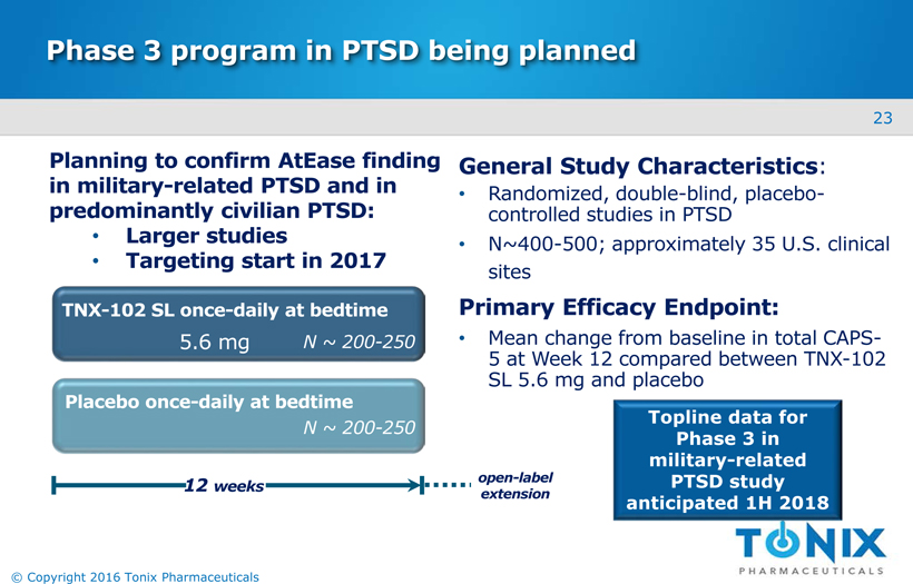AtEasestudy conclusions This Phase 2 trial is the first large multi-center trial of an investigational new drug product that demonstrated efficacy in a population with military-related PTSDSymptom reduction (CAPS-5) Functional improvement (Sheehan Disability Scale domains) Global improvement (CGI-I) Early effects on sleep and hyperarousal are consistent with the mechanistic hypothesis of TNX-102 SL primary actions on sleep disturbance and autonomic balance Systemic side effects included include somnolence, dry mouth, headache and sedation; local reactions to sublingual TNX-102 SL administration were common (transient tongue numbness) A post-hoc analysis suggested that enrolling patients with a higher CAPS-5 score (≥ 33) would be similar to the entry criteria used in the registration studies supporting the approval of the marketed PTSD drug productsSame post-hoc analysis revealed a larger separation from placebo in the subset of patients with baseline CAPS-5 ≥ 33 at weeks 2, 4, 8 and 12 Phase 3 program will use CAPS-5 ≥ 33 as enrollment threshold 22 © Copyright 2016 Tonix Pharmaceuticals