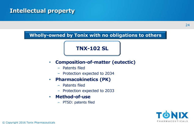 Phase 3 program in PTSD being planned General Study Characteristics: Randomized, double-blind, placebo-controlled studies in PTSD N~400-500; approximately 35 U.S. clinical sites Primary Efficacy Endpoint: Mean change from baseline in total CAPS-5 at Week 12 compared between TNX-102 SL 5.6 mg and placebo Topline data for Phase 3 in Planning to confirm AtEasefinding in military-related PTSD and in predominantly civilian PTSD: •Larger studies •Targeting start in 2017 Placebo once-daily at bedtime 12 weeks TNX-102 SL once-daily at bedtime N ~ 200-250 N ~ 200-250 5.6 mg open-labelextension military-related PTSD study anticipated 1H 2018 23 © Copyright 2016 Tonix Pharmaceuticals