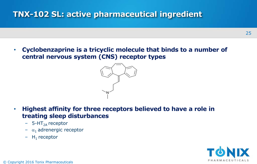 Intellectual property Composition-of-matter (eutectic)Patents filed Protection expected to 2034 Pharmacokinetics (PK)Patents filed Protection expected to 2033 Method-of-usePTSD: patents filed TNX-102 SL Wholly-owned by Tonixwith no obligations to others 24 © Copyright 2016 Tonix Pharmaceuticals