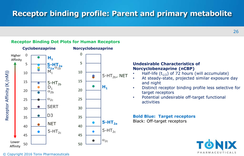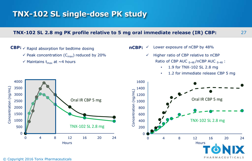 Receptor binding profile: Parent and primary metabolite 0 5 10 15 20 25 30 35 40 45 50 5-HT2c H1 5-HT2a α2c , NET 5-HT2b Undesirable Characteristics of Norcyclobenzaprine (nCBP) Half-life (t1/2) of 72 hours (will accumulate) At steady-state, projected similar exposure day and night Distinct receptor binding profile less selective for target receptors Potential undesirable off-target functional activities Bold Blue: Target receptors Black: Off-target receptors 0 5 10 15 20 25 30 35 40 45 50 Receptor Affinity (Ki (nM)) D1 α2b α2c SERT D3 NET 5-HT2c α1a M1 α1b H1 5-HT2a 5-HT2b Cyclobenzaprine Norcyclobenzaprine Lower Affinity Higher Affinity Receptor Binding Dot Plots for Human Receptors 26 © Copyright 2016 Tonix Pharmaceuticals