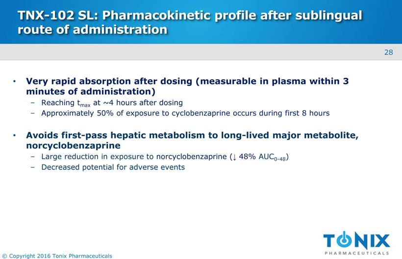 TNX-102 SL single-dose PK study TNX-102 SL 2.8 mg PK profile relative to 5 mg oral immediate release (IR) CBP: 0 500 1000 1500 2000 2500 3000 3500 4000 0 4 8 12 16 20 24 Concentration (ng/mL) TNX-102 SL 2.8 mg Oral IR CBP 5 mg xLower exposure of nCBP by 48% xHigher ratio of CBP relative to nCBP Ratio of CBP AUC 0-48 /nCBP AUC 0-48: •1.9 for TNX-102 SL 2.8 mg •1.2 for immediate release CBP 5 mg 0 200 400 600 800 1000 1200 1400 1600 0 4 8 12 16 20 24 Concentration (ng/mL) Oral IR CBP 5 mg TNX-102 SL 2.8 mg Hours Hours nCBP: xRapid absorption for bedtime dosing xPeak concentration (Cmax) reduced by 20% xMaintains tmaxat ~4 hours CBP: 27 © Copyright 2016 Tonix Pharmaceuticals