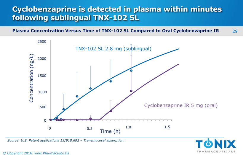 TNX-102 SL: Pharmacokinetic profile after sublingual route of administration Very rapid absorption after dosing (measurable in plasma within 3 minutes of administration)Reaching tmaxat ~4 hours after dosing Approximately 50% of exposure to cyclobenzaprine occurs during first 8 hours Avoids first-pass hepatic metabolism to long-lived major metabolite, norcyclobenzaprineLarge reduction in exposure to norcyclobenzaprine(↓48% AUC0-48) Decreased potential for adverse events 28 © Copyright 2016 Tonix Pharmaceuticals