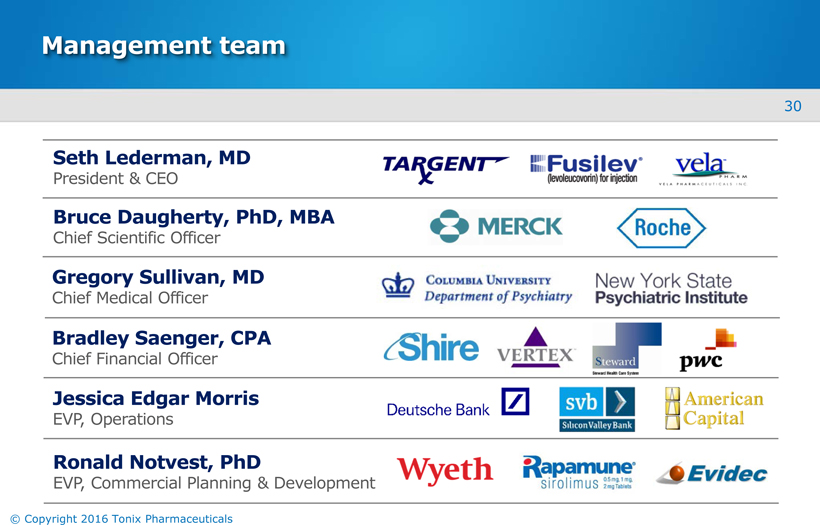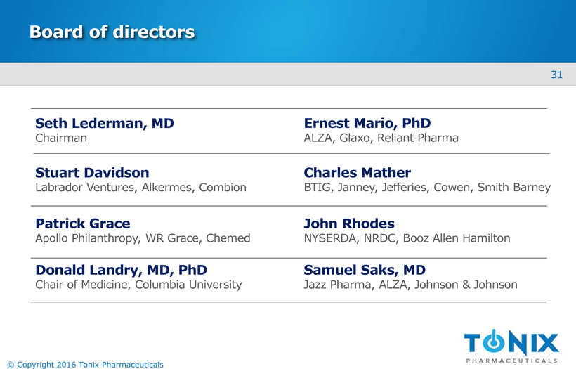 Management team Seth Lederman, MD President & CEO Jessica Edgar Morris EVP, Operations Bruce Daugherty, PhD, MBA Chief Scientific Officer Ronald Notvest, PhD EVP, Commercial Planning & Development Gregory Sullivan, MD Chief Medical Officer Bradley Saenger, CPA Chief Financial Officer 30 © Copyright 2016 Tonix Pharmaceuticals