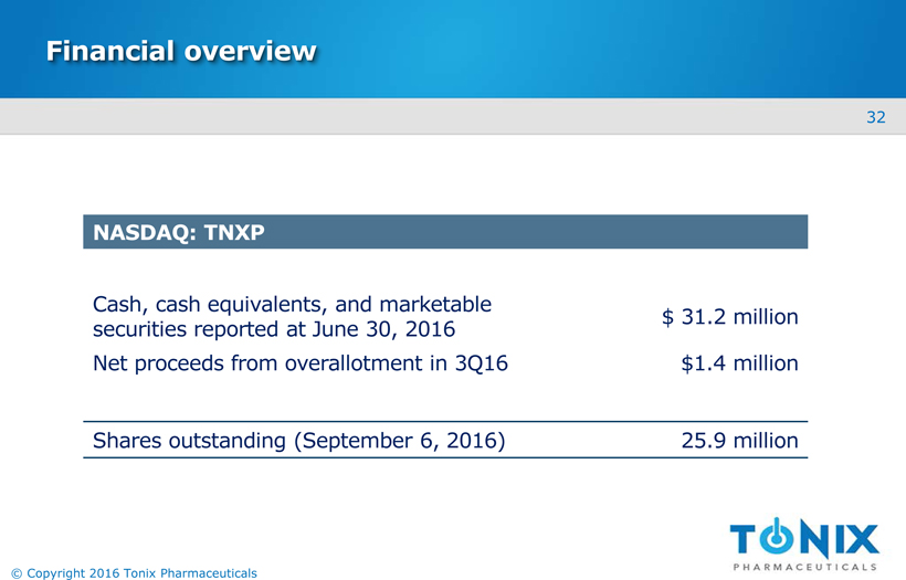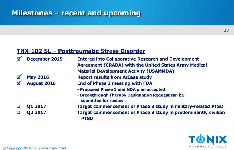 Financial overview NASDAQ:TNXP Cash, cash equivalents, andmarketable securitiesreported at June 30, 2016 $ 31.2 million Net proceeds from overallotment in 3Q16 $1.4 million Sharesoutstanding(September 6, 2016) 25.9 million 32 © Copyright 2016 Tonix Pharmaceuticals