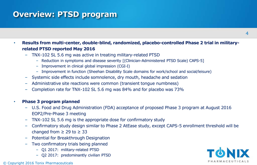Developinginnovative medicines for large and growing markets Targeting common central nervous system disordersOne clinical-stage proprietary candidate targeting posttraumatic stress disorder (PTSD) Differentiated product with potential for sustainable competitive advantages PTSD –Phase 2 trial reported May 2016TNX-102 SL15.6 mg was active in treating military-related PTSD Serious mental health problem2 Planning Phase 3 program in military-related PTSD Planning Phase 3 program in civilian PTSD All intellectual property owned by Tonix 1TNX-102 SL (cyclobenzaprine HClsublingual tablets) is an Investigational New Drug and is not approved for any indication. 2Schnurr, PP et al., Contemporary Clinical Trials 2015;41:75. 3 © Copyright 2016 Tonix Pharmaceuticals
