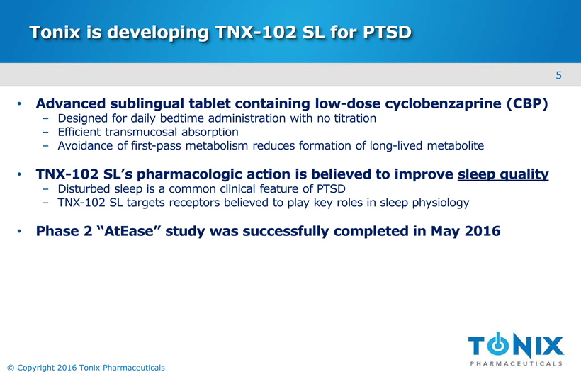Overview: PTSD program Results from multi-center, double-blind, randomized, placebo-controlled Phase 2 trial in military-related PTSD reported May 2016TNX-102 SL 5.6 mg was active in treating military-related PTSDReduction in symptoms and disease severity [(Clinician-Administered PTSD Scale) CAPS-5] Improvement in clinical global impression (CGI-I) Improvement in function (Sheehan Disability Scale domains for work/school and social/leisure) Systemic side effects include somnolence, dry mouth, headache and sedation Administrative site reactions were common (transient tongue numbness) Completion rate for TNX-102 SL 5.6 mg was 84% and for placebo was 73% Phase 3 program plannedU.S. Food and Drug Administration (FDA) acceptance of proposed Phase 3 program at August 2016 EOP2/Pre-Phase 3 meeting TNX-102 SL 5.6 mg is the appropriate dose for confirmatory study Confirmatory study design similar to Phase 2 AtEasestudy, except CAPS-5 enrollment threshold will be changed from ≥ 29 to ≥ 33 Potential for Breakthrough Designation Two confirmatory trials being planned Q1 2017: military-related PTSD Q2 2017: predominantly civilian PTSD 4 © Copyright 2016 Tonix Pharmaceuticals