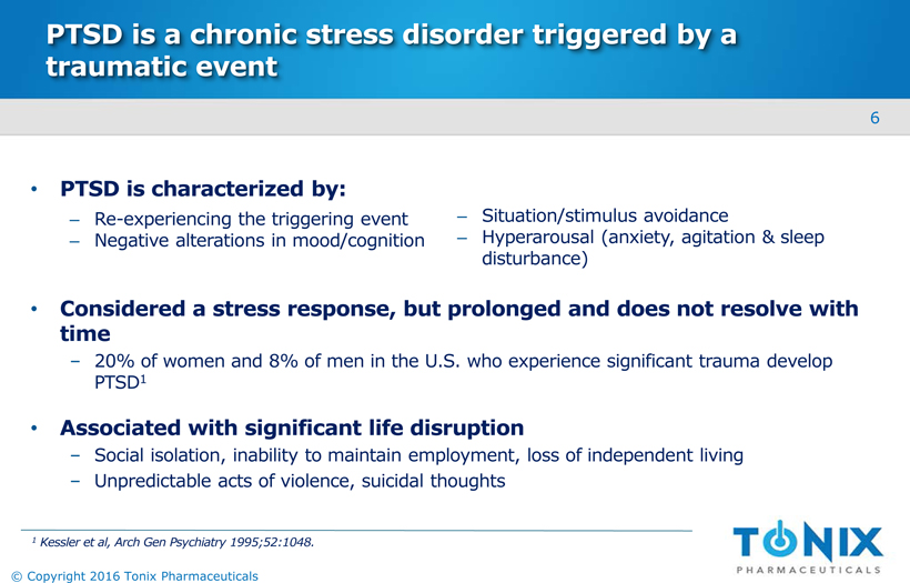 Tonix is developing TNX-102 SL for PTSD Advanced sublingual tablet containing low-dose cyclobenzaprine (CBP) Designed for daily bedtime administration with no titration Efficient transmucosalabsorption Avoidance of first-pass metabolism reduces formation of long-lived metabolite TNX-102 SL’s pharmacologic action is believed to improve sleep qualityDisturbed sleep is a common clinical feature of PTSD TNX-102 SL targets receptors believed to play key roles in sleep physiology Phase 2 “AtEase” study was successfully completed in May 2016 5 © Copyright 2016 Tonix Pharmaceuticals