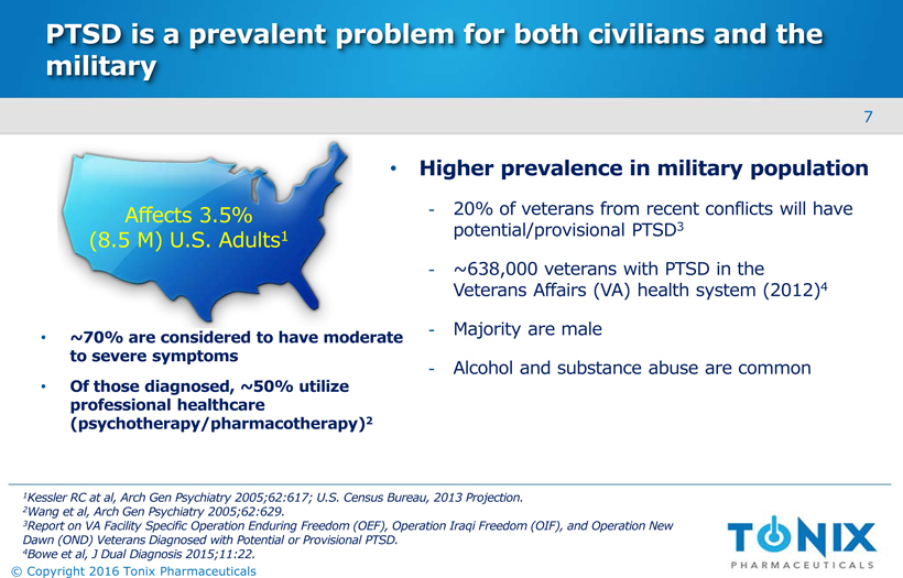 PTSD is a chronic stress disorder triggered by a traumatic event PTSD is characterized by: Considered a stress response, but prolonged and does not resolve with time20% of women and 8% of men in the U.S. who experience significant trauma develop PTSD1 Associated with significant life disruptionSocial isolation, inability to maintain employment, loss of independent living Unpredictable acts of violence, suicidal thoughts Re-experiencing the triggering event Negative alterations in mood/cognition Situation/stimulus avoidance Hyperarousal (anxiety, agitation & sleep disturbance) 1Kessler et al, Arch Gen Psychiatry 1995;52:1048. 6 © Copyright 2016 Tonix Pharmaceuticals