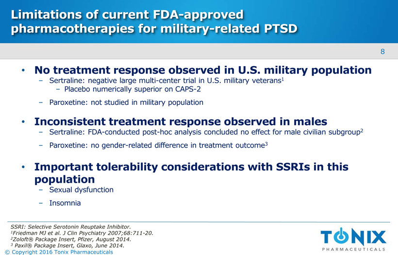 PTSD is a prevalent problem for both civilians and the military Affects 3.5% (8.5 M) U.S. Adults1 ~70% are considered to have moderate to severe symptoms Of those diagnosed, ~50% utilize professional healthcare (psychotherapy/pharmacotherapy)2 Higher prevalence in military population 20% of veterans from recent conflicts will have potential/provisional PTSD3 ~638,000 veterans with PTSD in the Veterans Affairs (VA) health system (2012)4 Majority are male Alcohol and substance abuse are common 1Kessler RC at al, Arch Gen Psychiatry 2005;62:617; U.S. Census Bureau, 2013 Projection. 2Wang et al, Arch Gen Psychiatry 2005;62:629. 3Report on VA Facility Specific Operation Enduring Freedom (OEF), Operation Iraqi Freedom (OIF), and Operation New Dawn (OND) Veterans Diagnosed with Potential or Provisional PTSD. 4Bowe et al, J Dual Diagnosis 2015;11:22. 7 © Copyright 2016 Tonix Pharmaceuticals