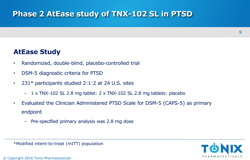 Limitations of current FDA-approved pharmacotherapies for military-related PTSD No treatment response observed in U.S. military populationSertraline: negative large multi-center trial in U.S. military veterans1Placebo numerically superior on CAPS-2 Paroxetine: not studied in military population Inconsistent treatment response observed in males Sertraline: FDA-conducted post-hoc analysis concluded no effect for male civilian subgroup2 Paroxetine: no gender-related difference in treatment outcome3 Important tolerability considerations with SSRIs in this populationSexual dysfunction Insomnia SSRI: Selective Serotonin Reuptake Inhibitor. 1Friedman MJ et al. J ClinPsychiatry 2007;68:711-20. 2Zoloft® Package Insert, Pfizer, August 2014. 3Paxil® Package Insert, Glaxo, June 2014. 8 © Copyright 2016 Tonix Pharmaceuticals