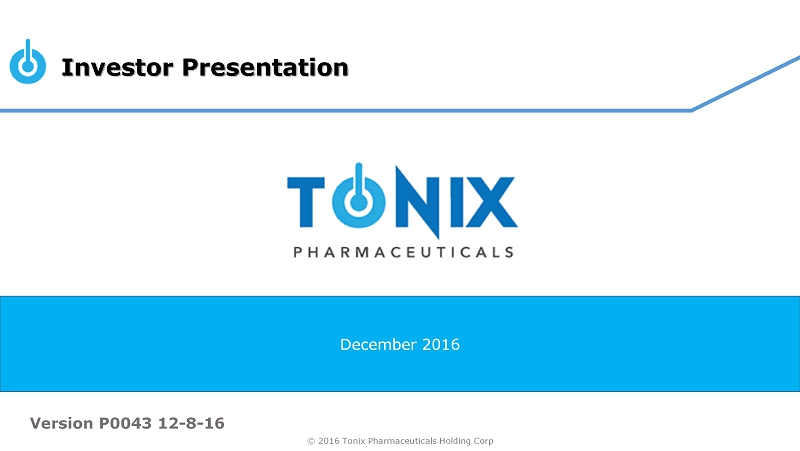 © 2016 Tonix Pharmaceuticals Holding Corp December 2016 Version P0043 12 - 8 - 16 Investor Presentation