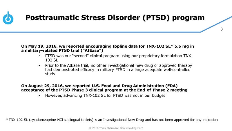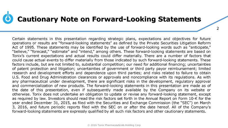 © 2016 Tonix Pharmaceuticals Holding Corp 2 Cautionary Note on Forward - Looking Statements Certain statements in this presentation regarding strategic plans, expectations and objectives for future operations or results are “forward - looking statements” as defined by the Private Securities Litigation Reform Act of 1995 . These statements may be identified by the use of forward - looking words such as “anticipate,” “believe,” “forecast,” “estimate” and “intend,” among others . These forward - looking statements are based on Tonix’s current expectations and actual results could differ materially . There are a number of factors that could cause actual events to differ materially from those indicated by such forward - looking statements . These factors include, but are not limited to, substantial competition ; our need for additional financing ; uncertainties of patent protection and litigation ; uncertainties of government or third party payor reimbursement ; limited research and development efforts and dependence upon third parties ; and risks related to failure to obtain U . S . Food and Drug Administration clearances or approvals and noncompliance with its regulations . As with any pharmaceutical under development, there are significant risks in the development, regulatory approval and commercialization of new products . The forward - looking statements in this presentation are made as of the date of this presentation, even if subsequently made available by the Company on its website or otherwise . Tonix does not undertake an obligation to update or revise any forward - looking statement, except as required by law . Investors should read the risk factors set forth in the Annual Report on Form 10 - K for the year ended December 31 , 2015 , as filed with the Securities and Exchange Commission (the “SEC”) on March 3 , 2016 , and future periodic reports filed with the SEC on or after the date hereof . All of the Company's forward - looking statements are expressly qualified by all such risk factors and other cautionary statements .