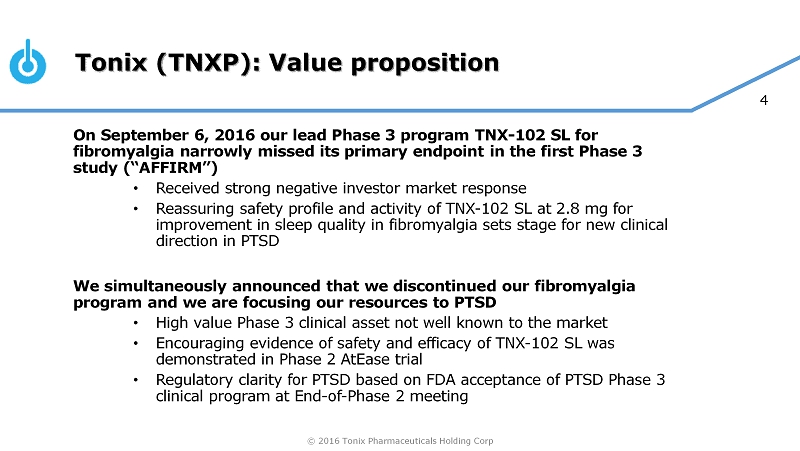 © 2016 Tonix Pharmaceuticals Holding Corp 3 Posttraumatic Stress Disorder (PTSD) program On May 19, 2016, we reported encouraging topline data for TNX - 102 SL* 5.6 mg in a military - related PTSD trial (“AtEase”) • PTSD was our “second” clinical program using our proprietary formulation TNX - 102 SL • Prior to the AtEase trial, no other investigational new drug or approved therapy had demonstrated efficacy in military PTSD in a large adequate well - controlled study On August 29, 2016, we reported U.S. Food and Drug Administration (FDA) acceptance of the PTSD Phase 3 clinical program at the End - of - Phase 2 meeting • However, advancing TNX - 102 SL for PTSD was not in our budget * TNX - 102 SL (cyclobenzaprine HCl sublingual tablets) is an Investigational New Drug and has not been approved for any indication