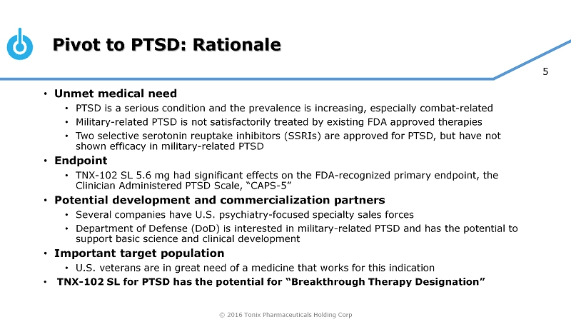 © 2016 Tonix Pharmaceuticals Holding Corp 4 Tonix (TNXP): Value proposition On September 6, 2016 our lead Phase 3 program TNX - 102 SL for fibromyalgia narrowly missed its primary endpoint in the first Phase 3 study (“AFFIRM”) • Received strong negative investor market response • Reassuring safety profile and activity of TNX - 102 SL at 2.8 mg for improvement in sleep quality in fibromyalgia sets stage for new clinical direction in PTSD We simultaneously announced that we discontinued our fibromyalgia program and we are focusing our resources to PTSD • High value Phase 3 clinical asset not well known to the market • Encouraging evidence of safety and efficacy of TNX - 102 SL was demonstrated in Phase 2 AtEase trial • Regulatory clarity for PTSD based on FDA acceptance of PTSD Phase 3 clinical program at End - of - Phase 2 meeting