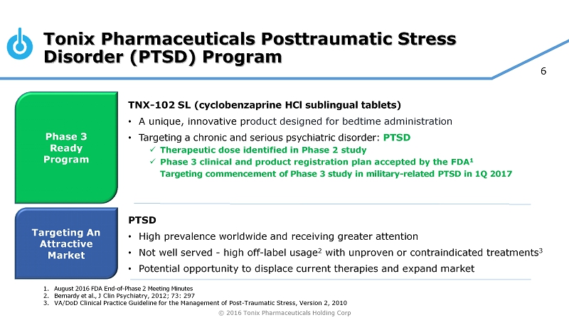 © 2016 Tonix Pharmaceuticals Holding Corp 5 Pivot to PTSD: Rationale • Unmet medical need • PTSD is a serious condition and the prevalence is increasing, especially combat - related • Military - related PTSD is not satisfactorily treated by existing FDA approved therapies • Two selective serotonin reuptake inhibitors (SSRIs) are approved for PTSD, but have not shown efficacy in military - related PTSD • Endpoint • TNX - 102 SL 5.6 mg had significant effects on the FDA - recognized primary endpoint, the Clinician Administered PTSD Scale, “CAPS - 5” • Potential development and commercialization p artners • Several companies have U.S. psychiatry - focused specialty sales forces • Department of Defense (DoD) is interested in military - related PTSD and has the potential to support basic science and clinical development • Important target population • U.S. veterans are in great need of a medicine that works for this indication • TNX - 102 SL for PTSD has the potential for “Breakthrough Therapy Designation”