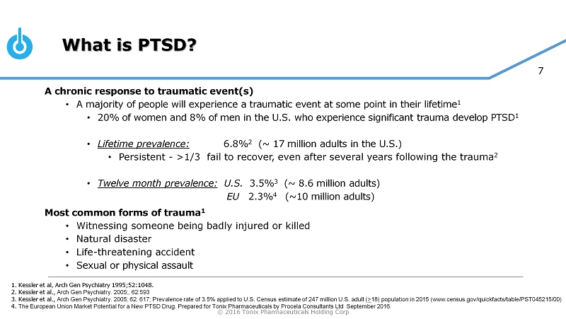 © 2016 Tonix Pharmaceuticals Holding Corp 6 Tonix Pharmaceuticals Posttraumatic Stress Disorder (PTSD) Program Phase 3 Ready Program Targeting An Attractive Market TNX - 102 SL (cyclobenzaprine HCl sublingual tablets) • A unique, innovative pr oduct designed for bedtime administration • Targeting a chronic and serious psychiatric disorder: PTSD x Therapeutic dose identified in Phase 2 study x Phase 3 clinical and product registration plan accepted by the FDA 1 Target ing commencement of Phase 3 study in military - related PTSD in 1Q 2017 PTSD • High prevalence worldwide and receiving greater attention • Not well served - high off - label usage 2 with unproven or contraindicated treatments 3 • Potential opportunity to displace current therapies and expand market © 2016 Tonix Pharmaceuticals Holding Corp 1. August 2016 FDA End - of - Phase 2 Meeting Minutes 2. Bernardy et al., J Clin Psychiatry, 2012; 73: 297 3. VA/DoD Clinical Practice Guideline for the Management of Post - Traumatic Stress, Version 2, 2010
