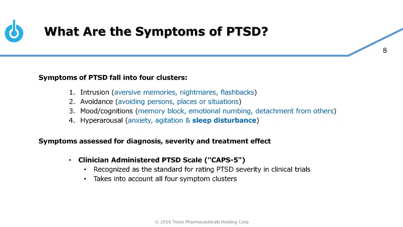 © 2016 Tonix Pharmaceuticals Holding Corp 7 What is PTSD? A chronic response to traumatic event(s) • A majority of people will experience a traumatic event at some point in their lifetime 1 • 20% of women and 8% of men in the U.S. who experience significant trauma develop PTSD 1 • Lifetime prevalence: 6.8% 2 (~ 17 million adults in the U.S.) • Persistent - >1/3 fail to recover, even after several years following the trauma 2 • Twelve month prevalence: U.S. 3.5% 3 (~ 8.6 million adults) EU 2.3% 4 (~10 million adults) Most common forms of trauma 1 • Witnessing someone being badly injured or killed • Natural disaster • Life - threatening accident • Sexual or physical assault 1. Kessler et al, Arch Gen Psychiatry 1995;52:1048. 2. Kessler et al., Arch Gen Psychiatry. 2005;, 62:593 3. Kessler et al., Arch Gen Psychiatry. 2005 ; 62: 617 ; Prevalence rate of 3.5% applied to U.S. Census estimate of 247 million U.S. adult ( > 18) population in 2015 (www.census.gov/quickfacts/table/PST045215/00) 4. The European Union Market Potential for a New PTSD Drug. Prepared for Tonix Pharmaceuticals by Procela Consultants Ltd Septe mbe r 2016.