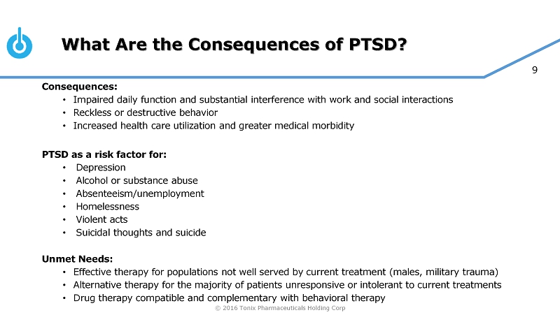 © 2016 Tonix Pharmaceuticals Holding Corp 8 What Are the Symptoms of PTSD? Symptoms of PTSD fall into four clusters: 1. Intrusion ( aversive memories, nightmares, flashbacks ) 2. Avoidance ( avoiding persons, places or situations ) 3. Mood/cognitions ( memory block, emotional numbing, detachment from others ) 4. Hyperarousal ( anxiety, agitation & sleep disturbance ) Symptoms assessed for diagnosis, severity and treatment effect • Clinician Administered PTSD Scale ("CAPS - 5") • Recognized as the standard for rating PTSD severity in clinical trials • Takes into account all four symptom clusters