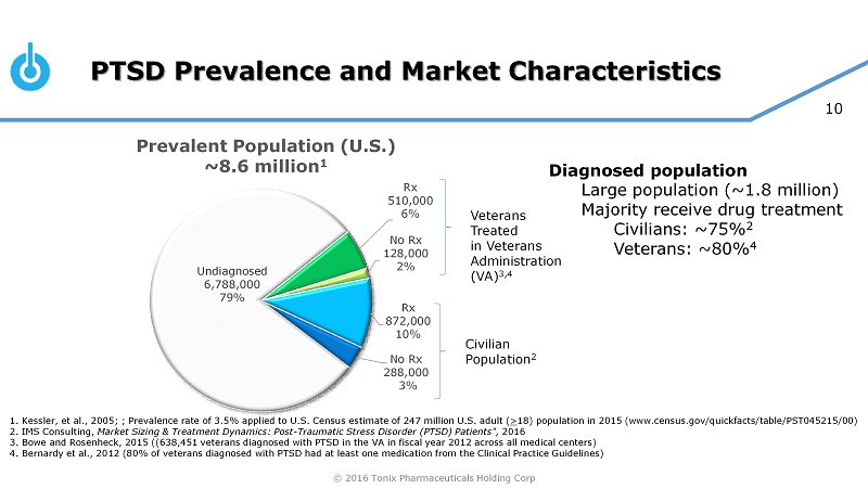 © 2016 Tonix Pharmaceuticals Holding Corp 9 What Are the Consequences of PTSD? Consequences: • Impaired daily function and substantial interference with work and social interactions • Reckless or destructive behavior • Increased health care utilization and greater medical morbidity PTSD as a risk f actor for: • Depression • Alcohol or substance abuse • Absenteeism/unemployment • Homelessness • Violent acts • Suicidal thoughts and suicide Unmet Needs : • Effective therapy for populations not well served by current treatment (males, military trauma) • Alternative therapy for the majority of patients unresponsive or intolerant to current treatments • Drug therapy compatible and complementary with behavioral therapy