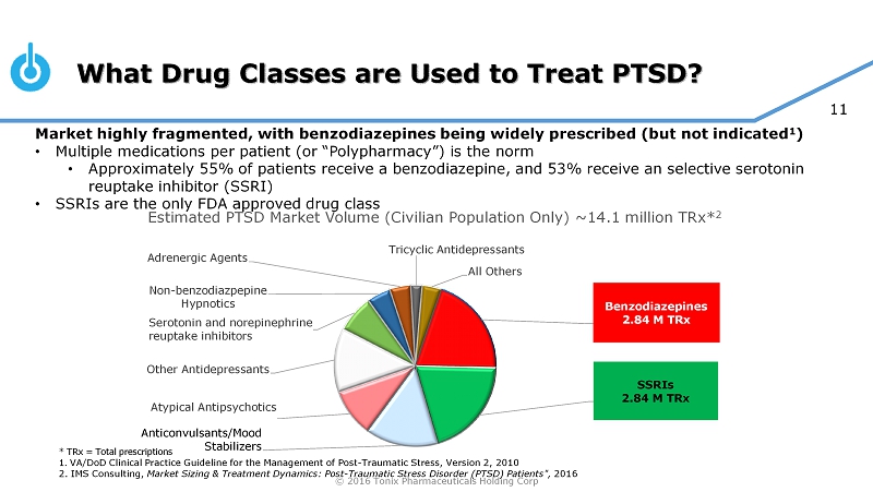 © 2016 Tonix Pharmaceuticals Holding Corp 10 PTSD Prevalence and Market Characteristics Undiagnosed 6,788,000 79% Rx 510,000 6% No Rx 128,000 2% Rx 872,000 10% No Rx 288,000 3% 1. Kessler, et al., 2005; ; Prevalence rate of 3.5% applied to U.S. Census estimate of 247 million U.S. adult ( > 18) population in 2015 (www.census.gov/quickfacts/table/PST045215/00) 2. IMS Consulting, Market Sizing & Treatment Dynamics: Post - Traumatic Stress Disorder (PTSD) Patients", 2016 3. Bowe and Rosenheck, 2015 ((638,451 veterans diagnosed with PTSD in the VA in fiscal year 2012 across all medical centers) 4. Bernardy et al., 2012 (80% of veterans diagnosed with PTSD had at least one medication from the Clinical Practice Guidelin es) Veterans Treated in Veterans Administration (VA) 3,4 Civilian Population 2 Diagnosed population Large population (~1.8 million) Majority receive drug treatment Civilians: ~75% 2 Veterans: ~80% 4 Prevalent Population (U.S.) ~8.6 million 1