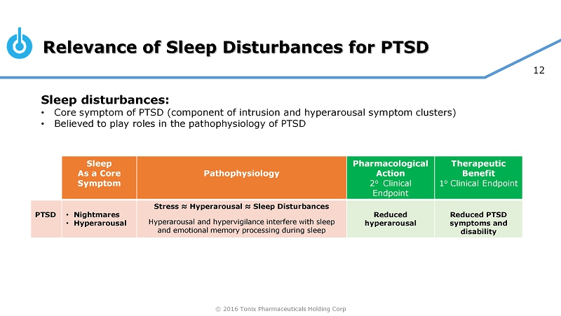 © 2016 Tonix Pharmaceuticals Holding Corp 11 What Drug Classes are Used to Treat PTSD? * TRx = Total prescriptions 1. VA/DoD Clinical Practice Guideline for the Management of Post - Traumatic Stress, Version 2, 2010 2. IMS Consulting, Market Sizing & Treatment Dynamics: Post - Traumatic Stress Disorder (PTSD) Patients", 2016 Benzodiazepines 2.84 M TRx SSRIs 2.84 M TRx Anticonvulsants/Mood Stabilizers Atypical Antipsychotics Other Antidepressants Serotonin and norepinephrine reuptake inhibitors Non - benzodiazpepine Hypnotics Adrenergic Agents Tricyclic Antidepressants All Others Estimated PTSD Market Volume (Civilian Population Only) ~14.1 million TRx* 2 Market highly fragmented, with benzodiazepines being widely prescribed (but not indicated 1 ) • Multiple medications per patient (or “Polypharmacy”) is the norm • Approximately 55% of patients receive a benzodiazepine, and 53% receive an selective serotonin reuptake inhibitor (SSRI) • SSRIs are the only FDA approved drug class