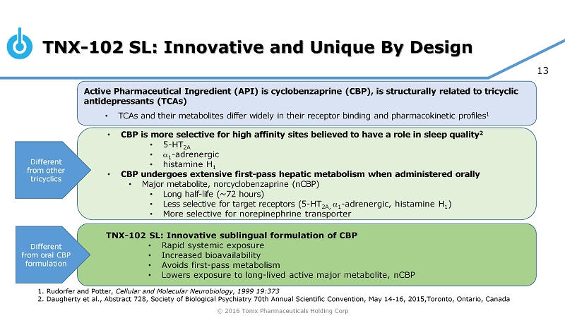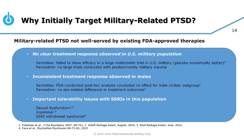 © 2016 Tonix Pharmaceuticals Holding Corp 13 • CBP is more selective for high affinity sites believed to have a role in sleep quality 2 • 5 - HT 2A • a 1 - adrenergic • histamine H 1 • CBP undergoes extensive first - pass hepatic metabolism when administered orally • Major metabolite, norcyclobenzaprine (nCBP) • Long half - life (~72 hours) • Less selective for target receptors ( 5 - HT 2A, a 1 - adrenergic, histamine H 1 ) • More selective for norepinephrine transporter TNX - 102 SL: Innovative and Unique By Design Active Pharmaceutical Ingredient (API) is cyclobenzaprine (CBP), is structurally related to tricyclic antidepressants (TCAs) • TCAs and their metabolites differ widely in their receptor binding and pharmacokinetic profiles 1 TNX - 102 SL: Innovative sublingual formulation of CBP • Rapid systemic exposure • Increased bioavailability • Avoids first - pass metabolism • Lowers exposure to long - lived active major metabolite, nCBP Different from other tricyclics Different from oral CBP formulation 1. Rudorfer and Potter, Cellular and Molecular Neurobiology, 1999 19:373 2. Daugherty et al., Abstract 728, Society of Biological Psychiatry 70th Annual Scientific Convention, May 14 - 16, 2015,Toronto, Ontario, Canada