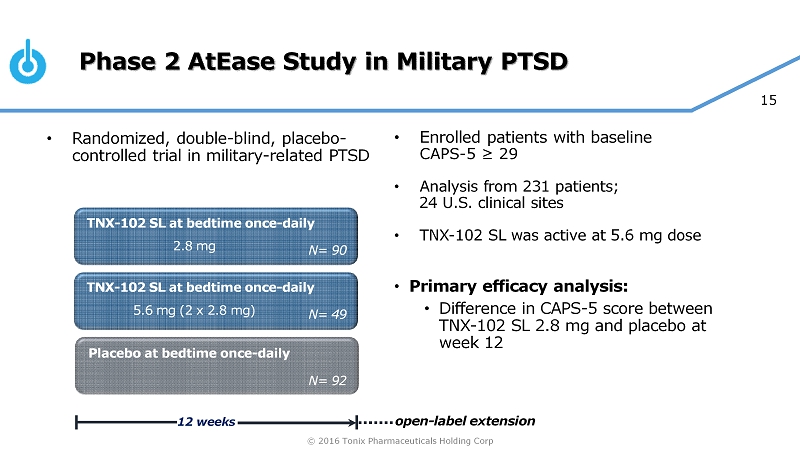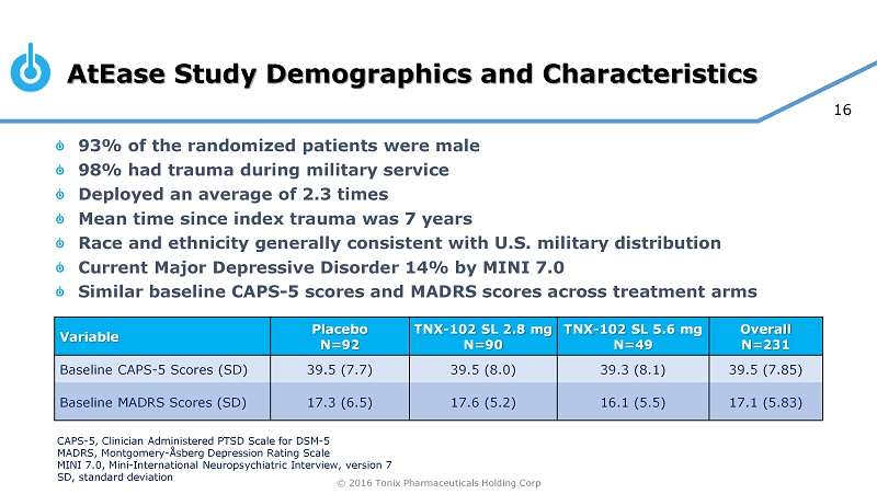 © 2016 Tonix Pharmaceuticals Holding Corp 15 Phase 2 AtEase Study in Military PTSD • Enrolled patients with baseline CAPS - 5 ≥ 29 • Analysis from 231 patients; 24 U.S. clinical sites • TNX - 102 SL was active at 5.6 mg dose • Primary efficacy analysis: • Difference in CAPS - 5 score between TNX - 102 SL 2.8 mg and placebo at week 12 TNX - 102 SL at bedtime once - daily Placebo at bedtime once - daily 12 weeks N= 90 TNX - 102 SL at bedtime once - daily N= 92 N= 49 2.8 mg 5.6 mg (2 x 2.8 mg) open - label extension • Randomized, double - blind, placebo - controlled trial in military - related PTSD