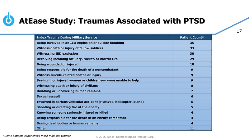 © 2016 Tonix Pharmaceuticals Holding Corp 16 AtEase Study Demographics and Characteristics 93% of the randomized patients were male 98% had trauma during military service Deployed an average of 2.3 times Mean time since index trauma was 7 years Race and ethnicity generally consistent with U.S. military distribution Current Major Depressive Disorder 14% by MINI 7.0 Similar baseline CAPS - 5 scores and MADRS scores across treatment arms Variable Placebo N=92 TNX - 102 SL 2.8 mg N=90 TNX - 102 SL 5.6 mg N=49 Overall N=231 Baseline CAPS - 5 Scores (SD) 39.5 (7.7) 39.5 (8.0) 39.3 (8.1) 39.5 (7.85) Baseline MADRS Scores (SD) 17.3 (6.5) 17.6 (5.2) 16.1 (5.5) 17.1 (5.83) CAPS - 5, Clinician Administered PTSD Scale for DSM - 5 MADRS, Montgomery - Åsberg Depression Rating Scale MINI 7.0, Mini - International Neuropsychiatric Interview, version 7 SD, standard deviation