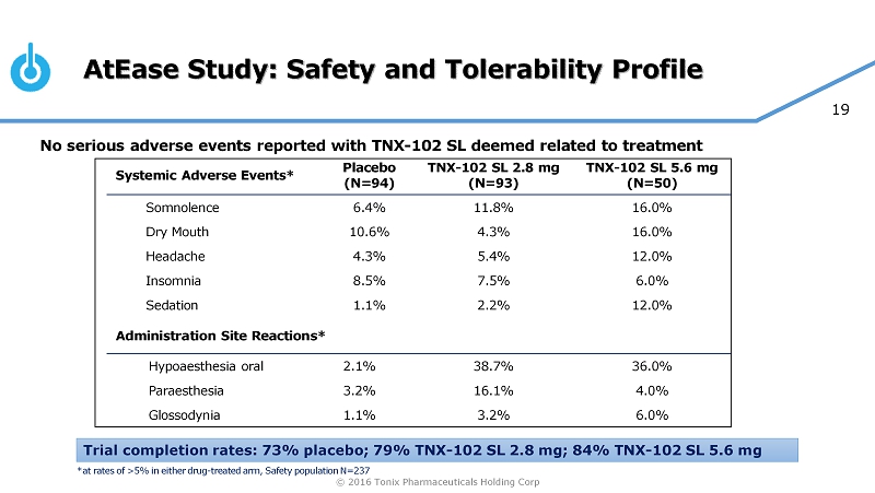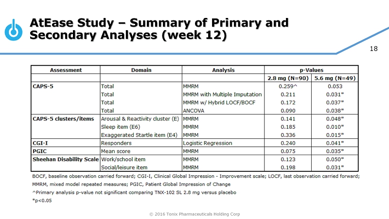 © 2016 Tonix Pharmaceuticals Holding Corp 18 AtEase Study – Summary of Primary and Secondary Analyses (week 12)