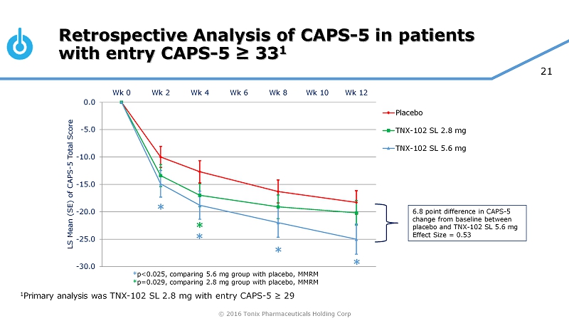 © 2016 Tonix Pharmaceuticals Holding Corp 20 0 0.1 0.2 0.3 0.4 0.5 0.6 Effect Size CAPS - 5 ≥ 29 0 0.1 0.2 0.3 0.4 0.5 0.6 Effect Size CAPS - 5 ≥33 AtEase: Retrospective Analysis for TNX - 102 SL 5.6 mg * MMRM, mixed - effects model repeated measures, p<0.05 Prior pharmacotherapy trials in PTSD used earlier versions of CAPS (e . g . CAPS - 2 ) • Different scoring range from CAPS - 5 • Most frequently used a score of ≥ 50 for entry (similar to CAPS - 5 ≥ 33 1 ) • FDA has accepted this higher entry criteria (CAPS - 5 ≥ 33 ) for Phase 3 program Compared CAPS - 5 Severity Entry Criteria ≥ 29 versus ≥ 33 on Effect Size for AtEase • Retrospective analysis showed more robust effect with high entry criteria * * * * 1 Sullivan, Gregory, et al. Poster session presented at: Military Health System Research Symposium (MHSRS) 2016 Annual Meeting; 20 16 Aug 15 - 18; Kissimmee, FL. URL: http://bit.ly/2bFo4mx