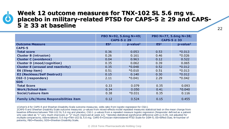 © 2016 Tonix Pharmaceuticals Holding Corp 21 Retrospective Analysis of CAPS - 5 in patients with entry CAPS - 5 ≥ 33 1 -30.0 -25.0 -20.0 -15.0 -10.0 -5.0 0.0 Wk 0 Wk 2 Wk 4 Wk 6 Wk 8 Wk 10 Wk 12 LS Mean (SE) of CAPS - 5 Total Score Placebo TNX-102 SL 2.8 mg TNX-102 SL 5.6 mg 6.8 point difference in CAPS - 5 change from baseline between placebo and TNX - 102 SL 5.6 mg Effect Size = 0.53 * * * * * * p<0.025, comparing 5.6 mg group with placebo, MMRM * p=0.029, comparing 2.8 mg group with placebo, MMRM 1 Primary analysis was TNX - 102 SL 2.8 mg with entry CAPS - 5 ≥ 29