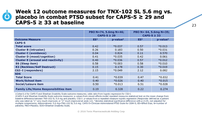 © 2016 Tonix Pharmaceuticals Holding Corp 22 Week 12 outcome measures for TNX - 102 SL 5.6 mg vs. placebo in military - related PTSD for CAPS - 5 ≥ 29 and CAPS - 5 ≥ 33 at baseline PBO N=92, 5.6mg N=49; CAPS - 5 ≥ 29 PBO N=77, 5.6mg N=38; CAPS - 5 ≥ 33 Outcome Measure ES 1 p - value 2 ES 1 p - value 2 CAPS - 5 Total score 0.36 0.053 0.53 *0.013 Cluster B (intrusion) 0.26 0.161 0.46 *0.026 Cluster C (avoidance) 0.04 0.963 0.12 0.522 Cluster D (mood/cognition) 0.35 0.062 0.39 0.065 Cluster E (arousal and reactivity) 0.35 *0.048 0.52 *0.012 E6 (Sleep item) 0.51 *0.010 0.51 *0.013 E2 (Reckless/Self Destruct) 0.15 0.140 0.30 *0.012 CGI – I (responders) 2.11 *0.041 2.29 *0.042 SDS Total Score 0.33 0.079 0.35 0.093 Work/School item 0.34 0.050 0.41 *0.040 Social/Leisure item 0.38 *0.031 0.35 0.116 Family Life/Home Responsibilities item 0.12 0.524 0.15 0.455 1Cohen’s d for CAPS - 5 and Sheehan Disability Scale outcome measures; odds ratio from logistic regression for CGI - I. 2CAPS - 5 and Sheehan Disability Scale outcome measures: p - values from mixed - effects model repeated measures statistical test on the mean change from baseline difference between TNX - 102 SL 5.6 mg and placebo; CGI - I: p - values from a repeated measure logistic regression (Responde r defined as a patient who was rated as “1” very much improved, or “2” much improved at week 12). *denotes statistical significance difference with p<0 .05, not adjusted for multiple comparisons; Abbreviations: 5.6 mg=TNX - 102 SL 5.6 mg; CAPS - 5=Clinician - Administered PTSD Scale for DSM - 5; ES=Effect Siz e; N=number of patients; PBO=Placebo; SDS=Sheehan Disability Scale.