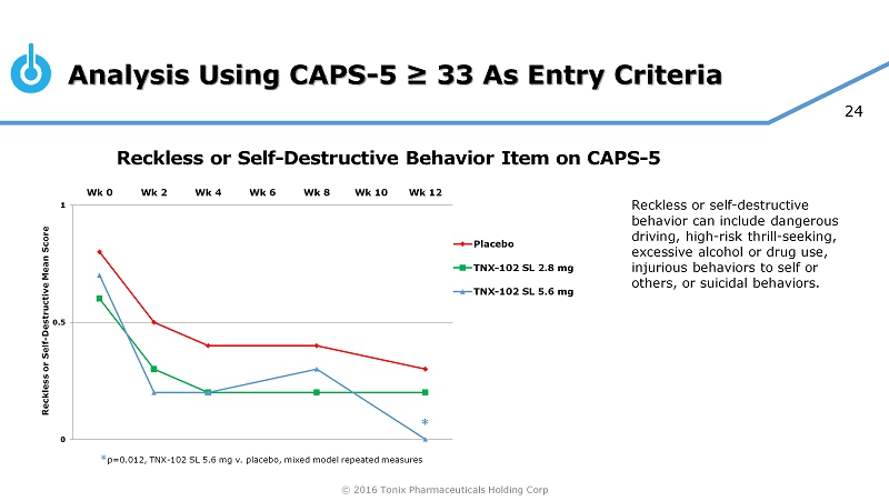 © 2016 Tonix Pharmaceuticals Holding Corp 23 Week 12 outcome measures for TNX - 102 SL 5.6 mg vs. placebo in combat PTSD subset for CAPS - 5 ≥ 29 and CAPS - 5 ≥ 33 at baseline PBO N=74, 5.6mg N=46; CAPS - 5 ≥ 29 PBO N= 64, 5.6mg N=35; CAPS - 5 ≥ 33 Outcome Measure ES 1 p - value 2 ES 1 p - value 2 CAPS - 5 Total score 0.42 *0.037 0.57 *0.013 Cluster B (intrusion) 0.26 0.183 0.50 *0.031 Cluster C (avoidance) 0.04 0.824 0.11 0.570 Cluster D (mood/cognition) 0.41 *0.035 0.42 0.061 Cluster E (arousal and reactivity) 0.40 *0.036 0.57 *0.012 E6 (Sleep item) 0.58 *0.003 0.58 *0.010 E2 (Reckless/Self Destruct) 0.15 0.178 0.30 *0.019 CGI – I (responders) 2.15 *0.049 2.12 0.082 SDS Total Score 0.41 *0.039 0.47 *0.032 Work/School item 0.40 *0.026 0.40 *0.015 Social/Leisure item 0.50 *0.013 0.51 *0.028 Family Life/Home Responsibilities item 0.19 0.328 0.22 0.274 1Cohen’s d for CAPS - 5 and Sheehan Disability Scale outcome measures; odds ratio from logistic regression for CGI - I. 2CAPS - 5 and Sheehan Disability Scale outcome measures: p - values from mixed - effects model repeated measures statistical test on t he mean change from baseline difference between TNX - 102 SL 5.6 mg and placebo; CGI - I: p - values from a repeated measure logistic regression (Responde r defined as a patient who was rated as “1” very much improved, or “2” much improved at week 12). *denotes statistical significance difference with p<0 .05, not adjusted for multiple comparisons; Abbreviations: 5.6 mg=TNX - 102 SL 5.6 mg; CAPS - 5=Clinician - Administered PTSD Scale for DSM - 5; ES=Effect Siz e; N=number of patients; PBO=Placebo; SDS=Sheehan Disability Scale.