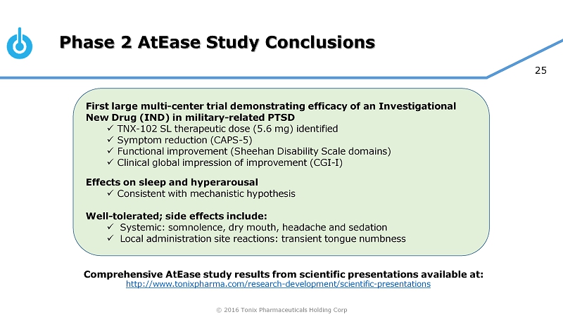 © 2016 Tonix Pharmaceuticals Holding Corp 24 Analysis Using CAPS - 5 ≥ 33 As Entry Criteria Reckless or Self - Destructive Behavior Item on CAPS - 5 0 0.5 1 Wk 0 Wk 2 Wk 4 Wk 6 Wk 8 Wk 10 Wk 12 Reckless or Self - Destructive Mean Score Placebo TNX-102 SL 2.8 mg TNX-102 SL 5.6 mg * * p=0.012, TNX - 102 SL 5.6 mg v. placebo, mixed model repeated measures Reckless or self - destructive behavior can include dangerous driving, high - risk thrill - seeking, excessive alcohol or drug use, injurious behaviors to self or others, or suicidal behaviors.