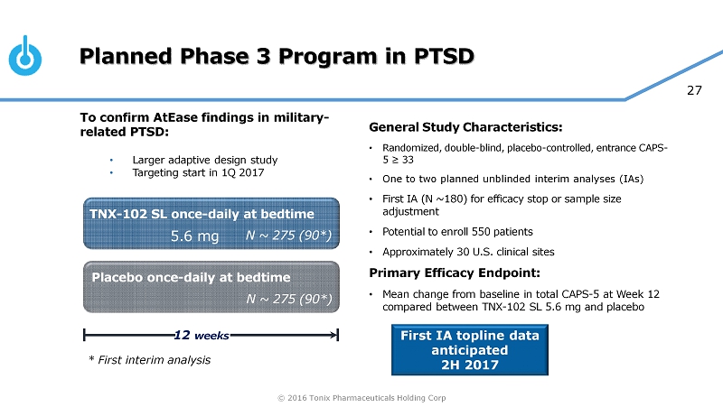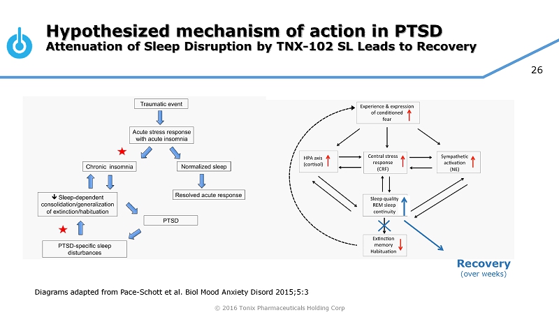 © 2016 Tonix Pharmaceuticals Holding Corp 26 Hypothesized mechanism of action in P TSD Attenuation of Sleep Disruption by TNX - 102 SL Leads to Recovery Recovery (over weeks) Diagrams adapted from Pace - Schott et al. Biol Mood Anxiety Disord 2015;5:3