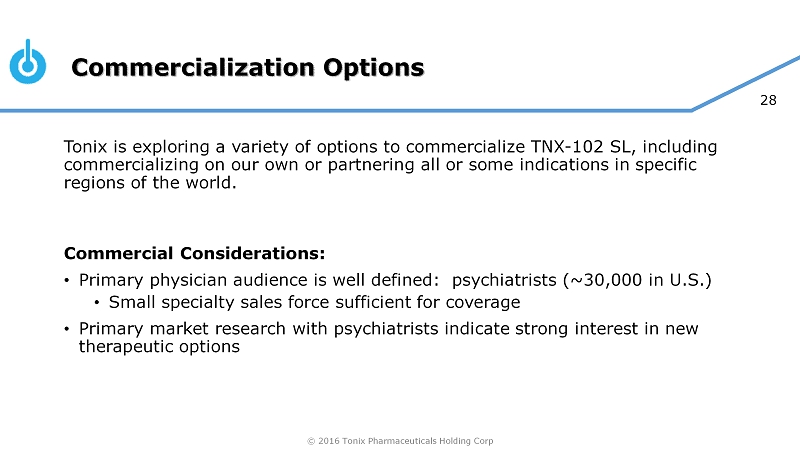 © 2016 Tonix Pharmaceuticals Holding Corp 27 Planned Phase 3 Program in PTSD General Study Characteristics: • Randomized, double - blind, placebo - controlled, entrance CAPS - 5 ≥ 33 • One to two planned unblinded interim analyses (IAs) • First IA (N ~180) for efficacy stop or sample size adjustment • Potential to enroll 550 patients • Approximately 30 U.S. clinical sites Primary Efficacy Endpoint: • Mean change from baseline in total CAPS - 5 at Week 12 compared between TNX - 102 SL 5.6 mg and placebo Placebo once - daily at bedtime 12 weeks TNX - 102 SL once - daily at bedtime N ~ 275 (90*) N ~ 275 (90*) 5.6 mg First IA topline data anticipated 2H 2017 To confirm AtEase findings in military - related PTSD: • Larger adaptive design study • Targeting start in 1Q 2017 * First interim analysis