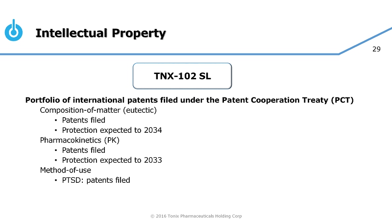 © 2016 Tonix Pharmaceuticals Holding Corp 29 Intellectual Property Portfolio of international patents filed under the Patent Cooperation Treaty (PCT) C omposition - of - matter (eutectic) • Patents filed • Protection expected to 2034 Pharmacokinetics (PK) • Patents filed • Protection expected to 2033 Method - of - use • PTSD: patents filed TNX - 102 SL