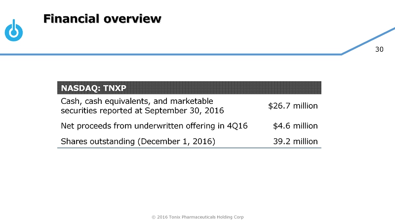 © 2016 Tonix Pharmaceuticals Holding Corp 30 Financial overview NASDAQ: TNXP Cash, cash equivalents, and marketable securities reported at September 30, 2016 $26.7 million Net proceeds from underwritten offering in 4Q16 $4.6 million Shares outstanding (December 1, 2016) 39.2 million