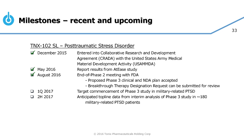 © 2016 Tonix Pharmaceuticals Holding Corp 32 Board of Directors Seth Lederman, MD Chairman Ernest Mario, PhD ALZA, Glaxo, Reliant Pharma John Rhodes NYSERDA, NRDC, Booz Allen Hamilton Samuel Saks, MD Jazz Pharma, ALZA, Johnson & Johnson Charles Mather BTIG, Janney, Jefferies, Cowen, Smith Barney Stuart Davidson Labrador Ventures, Alkermes , Combion Patrick Grace Apollo Philanthropy, WR Grace, Chemed Donald Landry, MD, PhD Chair of Medicine, Columbia University