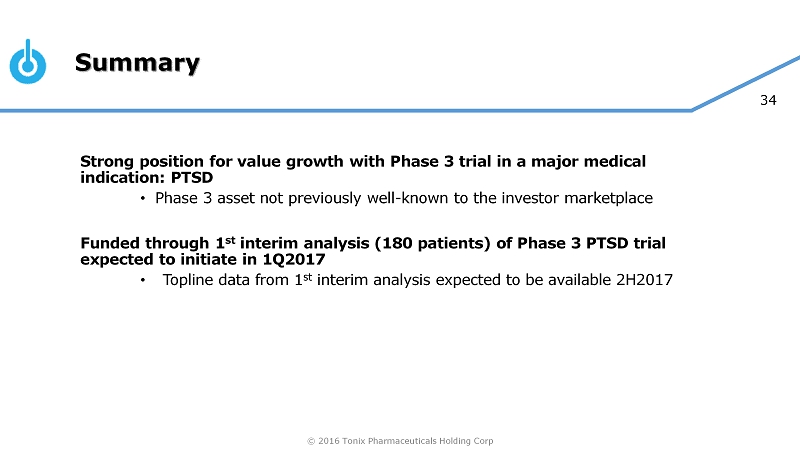 © 2016 Tonix Pharmaceuticals Holding Corp 33 Milestones – recent and upcoming TNX - 102 SL – Posttraumatic Stress Disorder □ December 2015 Entered into Collaborative Research and Development Agreement (CRADA) with the United States Army Medical Materiel Development Activity (USAMMDA) □ May 2016 Report results from AtEase study □ August 2016 End - of - Phase 2 meeting with FDA - Proposed Phase 3 clinical and NDA plan accepted - Breakthrough Therapy Designation Request can be submitted for review □ 1Q 2017 Target commencement of Phase 3 study in military - related PTSD □ 2H 2017 Anticipated t opline data from interim analysis of Phase 3 study in ~180 military - related PTSD patients x x x