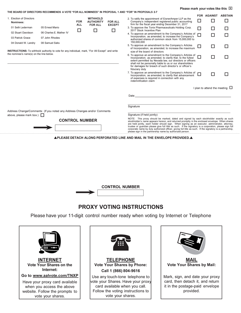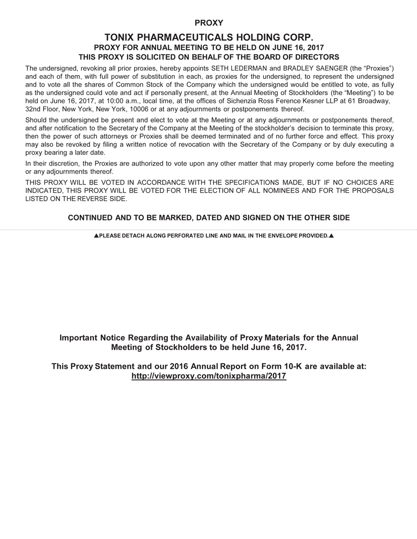 The Proxy Statement and Annual Report on Form 10-K for the year ended December 31, 2016 are available at: http://viewproxy.com/tonixpharma/2017/.