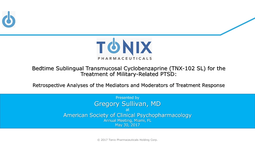 © 2017 Tonix Pharmaceuticals Holding Corp. Presented by Gregory Sullivan, MD at American Society of Clinical Psychopharmacology Annual Meeting, Miami, FL May 30, 2017 Bedtime Sublingual Transmucosal Cyclobenzaprine (TNX - 102 SL) for the Treatment of Military - Related PTSD: Retrospective Analyses of the Mediators and Moderators of Treatment Response