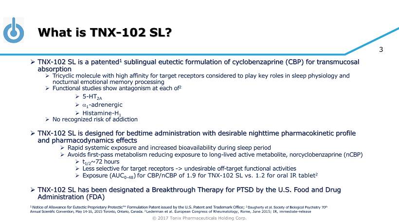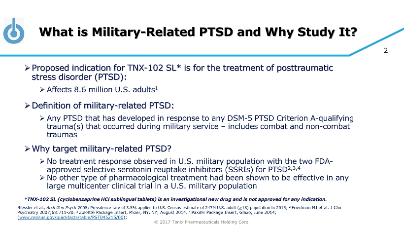 © 2017 Tonix Pharmaceuticals Holding Corp. 2 What is Military - Related PTSD and Why Study It? » Proposed indication for TNX - 102 SL* is for the treatment of posttraumatic stress disorder (PTSD): » Affects 8.6 million U.S. adults 1 » Definition of military - related PTSD: » Any PTSD that has developed in response to any DSM - 5 PTSD Criterion A - qualifying trauma(s) that occurred during military service – includes combat and non - combat traumas » Why target military - related PTSD? » No treatment response observed in U.S. military population with the two FDA - approved selective serotonin reuptake inhibitors (SSRIs) for PTSD 2,3,4 » No other type of pharmacological treatment had been shown to be effective in any large multicenter clinical trial in a U.S. military population 1 Kessler et al., Arch Gen Psych 2005; Prevalence rate of 3.5% applied to U.S. Census estimate of 247M U.S. adult ( > 18) population in 2015; 2 Friedman MJ et al. J Clin Psychiatry 2007;68:711 - 20. 3 Zoloft® Package Insert, Pfizer, NY, NY; August 2014. 4 Paxil® Package Insert, Glaxo, June 2014; ( www.census.gov/quickfacts/table/PST045215/00 ) ; *T NX - 102 SL (cyclobenzaprine HCl sublingual tablets) is an investigational new drug and is not approved for any indication.