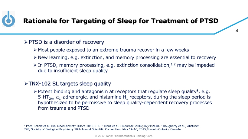 © 2017 Tonix Pharmaceuticals Holding Corp. 3 What is TNX - 102 SL? » TNX - 102 SL is a patented 1 sublingual eutectic formulation of cyclobenzaprine (CBP) for transmucosal absorption » Tricyclic molecule with high affinity for target receptors considered to play key roles in sleep physiology and nocturnal emotional memory processing » F unctional studies show antagonism at each of 2 » 5 - HT 2A » a 1 - adrenergic » Histamine - H 1 » No recognized risk of addiction » TNX - 102 SL is designed for bedtime administration with desirable nighttime pharmacokinetic profile and pharmacodynamics effects » Rapid systemic exposure and increased bioavailability during sleep period » Avoids first - pass metabolism reducing exposure to long - lived active metabolite, norcyclobenzaprine ( nCBP ) » t 1/2 ~72 hours » Less selective for target receptors - > undesirable off - target functional activities » Exposure ( AUC 0 - 48 ) for CBP/ nCBP of 1.9 for TNX - 102 SL vs. 1.2 for oral IR tablet 2 » TNX - 102 SL has been designated a Breakthrough Therapy for PTSD by the U.S. Food and Drug Administration (FDA) 1 Notice of Allowance for Eutectic Proprietary Protectic ™ Formulation Patent issued by the U.S. Patent and Trademark Office; 2 Daugherty et al. Society of Biological Psychiatry 70 th Annual Scientific Convention, May 14 - 16, 2015 Toronto, Ontario, Canada. 3 Lederman et al. European Congress of Rheumatology, Rome, June 2015; IR, immediate - release
