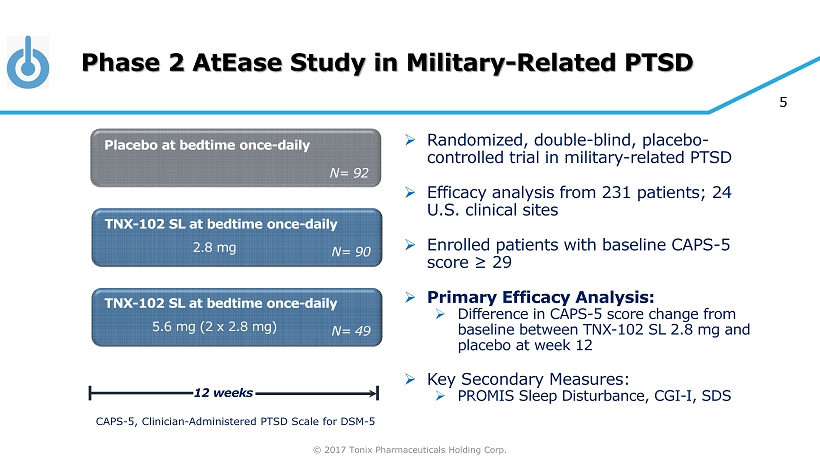 © 2017 Tonix Pharmaceuticals Holding Corp. 4 Rationale for Targeting of Sleep for Treatment of PTSD » PTSD is a disorder of recovery » Most people exposed to an extreme trauma recover in a few weeks » New learning, e.g. extinction, and memory processing are essential to recovery » In PTSD, memory processing, e.g. extinction consolidation, 1,2 may be impeded due to insufficient sleep quality » TNX - 102 SL targets sleep quality » Potent binding and antagonism at receptors that regulate sleep quality 3 , e.g. 5 - HT 2A , a 1 - adrenergic, and histamine H 1 receptors, during the sleep period is hypothesized to be permissive to sleep quality - dependent recovery processes from trauma and PTSD 1 Pace - Schott et al. Biol Mood Anxiety Disord 2015;5:3. 2 Menz et al. J Neurosci 2016;36(7):2148. 3 Daugherty et al., Abstract 728, Society of Biological Psychiatry 70th Annual Scientific Convention, May 14 - 16, 2015,Toronto Ontario, Canada