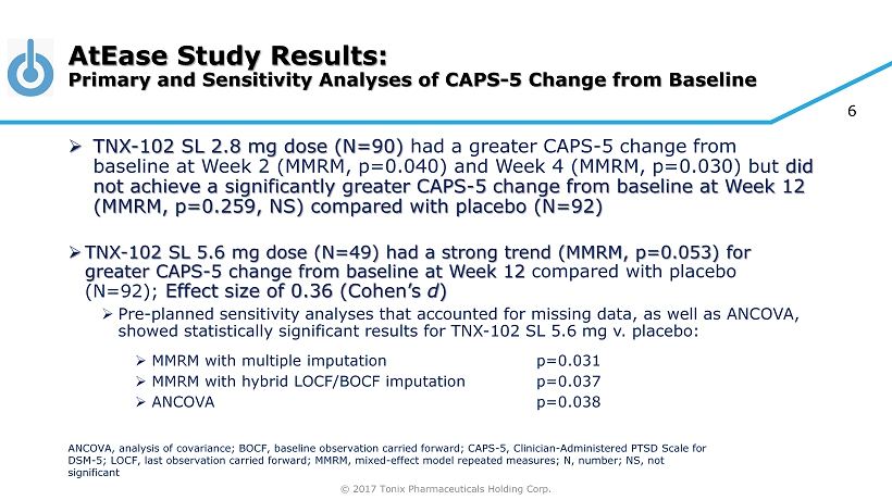 © 2017 Tonix Pharmaceuticals Holding Corp. 5 Phase 2 AtEase Study in Military - Related PTSD » Randomized, double - blind, placebo - controlled trial in military - related PTSD » Efficacy analysis from 231 patients; 24 U.S. clinical sites » Enrolled patients with baseline CAPS - 5 score ≥ 29 » Primary Efficacy Analysis: » Difference in CAPS - 5 score change from baseline between TNX - 102 SL 2.8 mg and placebo at week 12 » Key Secondary Measures: » PROMIS Sleep Disturbance, CGI - I, SDS TNX - 102 SL at bedtime once - daily Placebo at bedtime once - daily 12 weeks N= 90 TNX - 102 SL at bedtime once - daily N= 92 N= 49 2.8 mg 5.6 mg (2 x 2.8 mg) CAPS - 5, Clinician - Administered PTSD Scale for DSM - 5