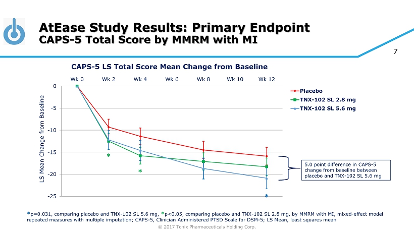 © 2017 Tonix Pharmaceuticals Holding Corp. 6 AtEase Study Results: Primary and Sensitivity Analyses of CAPS - 5 Change from Baseline » TNX - 102 SL 2.8 mg dose (N=90) had a greater CAPS - 5 change from baseline at Week 2 (MMRM, p=0.040) and Week 4 (MMRM, p=0.030) but did not achieve a significantly greater CAPS - 5 change from baseline at Week 12 (MMRM, p=0.259, NS) compared with placebo (N=92) » TNX - 102 SL 5.6 mg dose (N=49) had a strong trend (MMRM, p=0.053) for greater CAPS - 5 change from baseline at Week 12 compared with placebo (N=92); Effect size of 0.36 (Cohen’s d ) » Pre - planned sensitivity analyses that accounted for missing data, as well as ANCOVA, showed statistically significant results for TNX - 102 SL 5.6 mg v. placebo: » MMRM with multiple imputation p=0.031 » MMRM with hybrid LOCF/BOCF imputation p=0.037 » ANCOVA p=0.038 ANCOVA, analysis of covariance; BOCF, baseline observation carried forward; CAPS - 5, Clinician - Administered PTSD Scale for DSM - 5; LOCF, last observation carried forward; MMRM, mixed - effect model repeated measures; N, number; NS, not significant