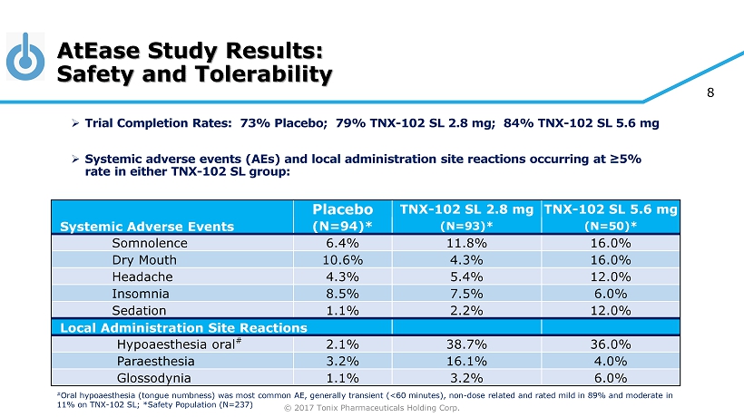 © 2017 Tonix Pharmaceuticals Holding Corp. 7 AtEase Study Results: Primary Endpoint CAPS - 5 Total Score by MMRM with MI -25 -20 -15 -10 -5 0 Wk 0 Wk 2 Wk 4 Wk 6 Wk 8 Wk 10 Wk 12 Placebo TNX-102 SL 2.8 mg TNX-102 SL 5.6 mg * * p=0.031, comparing placebo and TNX - 102 SL 5.6 mg, * p<0.05, comparing placebo and TNX - 102 SL 2.8 mg, by MMRM with MI, mixed - effect model repeated measures with multiple imputation; CAPS - 5, Clinician Administered PTSD Scale for DSM - 5; LS Mean, least squares mean * * CAPS - 5 LS Total Score Mean Change from Baseline 5.0 point difference in CAPS - 5 change from baseline between placebo and TNX - 102 SL 5.6 mg LS Mean Change from Baseline