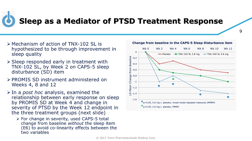 © 2017 Tonix Pharmaceuticals Holding Corp. 8 AtEase Study Results: Safety and Tolerability » Trial Completion Rates: 73% Placebo; 79% TNX - 102 SL 2.8 mg; 84% TNX - 102 SL 5.6 mg » Systemic adverse events (AEs) and local administration site reactions occurring at ≥5% rate in either TNX - 102 SL group: Placebo TNX - 102 SL 2.8 mg TNX - 102 SL 5.6 mg Systemic Adverse Events (N=94)* (N=93)* (N=50)* Somnolence 6.4% 11.8% 16.0% Dry Mouth 10.6% 4.3% 16.0% Headache 4.3% 5.4% 12.0% Insomnia 8.5% 7.5% 6.0% Sedation 1.1% 2.2% 12.0% Local Administration Site Reactions Hypoaesthesia oral # 2.1% 38.7% 36.0% Paraesthesia 3.2% 16.1% 4.0% Glossodynia 1.1% 3.2% 6.0% # Oral hypoaesthesia (tongue numbness) was most common AE, generally transient (<60 minutes), non - dose related and rated mild in 89% and moderate in 11% on TNX - 102 SL; *Safety Population (N=237)